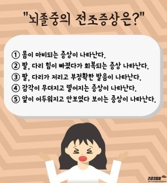 뇌졸중의 증상은 다양하며 허혈성 뇌졸중의 경우 갑작스러운 두통 언어 및 인지 기능 장애 팔다리의 약화 등의 증상이 나타날 수 있다. 출혈성 뇌졸중의 경우 갑작스러운 두통 혼돈 균형 장애 구토 의식 상실 등의 증상이 나타날 수 있다. 이러한 증상이 나타날 경우 즉각적으로 의료진의 치료가 필요하다. 뇌졸중은 일부 위험 요인이 있을 때 발생할 가능성이 높다. 일부 위험 요인으로는 고혈압 당뇨병 고콜레스테롤 비만 흡연 불규칙한 식습관 및 운동부족 등이 있다. 이러한 위험 요소를 감소시키는 것은 뇌졸중의 발생가능성을 낮출 수 있다. 예방적인 방법으로는 건강한 생활습관 유지 정기적인 건강검진 고혈압 당뇨병 고 콜레스테롤 등의 위험 요소감소가 있다.