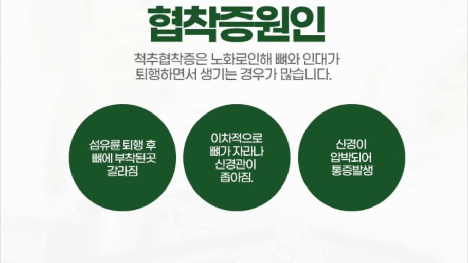 척추협착증은 척추 내부의 공간이 좁아져서 척추나 척추신경이 압박되어 생기는 질환이다. 이는 노화로 인해 척추 디스크와 척추뼈가 변형되거나 골절로 인해 발생할 수 있다. 척추는 척추와 많은 신경을 안전하게 감싸고 보호하는 역할을 한다. 그러나 척추협착증은 척추 주변의 공간이 좁아져서 척수와 주변 신경을 압박하는 상황을 뜻하다 이 압박은 척수와 주변 신경의 기능을 제한하고 신경적인 증상을 일으키며 심한 경우에는 신경 손상을 유발할 수 있다. 척추협착증의 증상은 다양하다. 가장 일반적인 증상은 통증과 저림 혹은 마비감 등의 신경 증상이다.